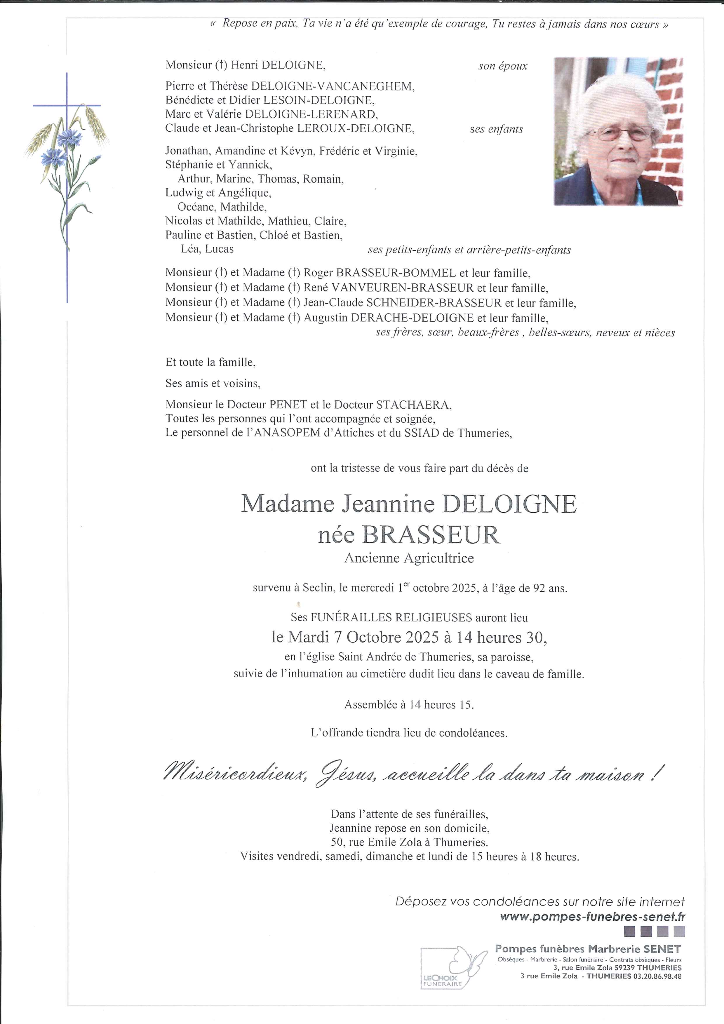 Avis de décès de Madame Jeannine DELOIGNE née BRASSEUR