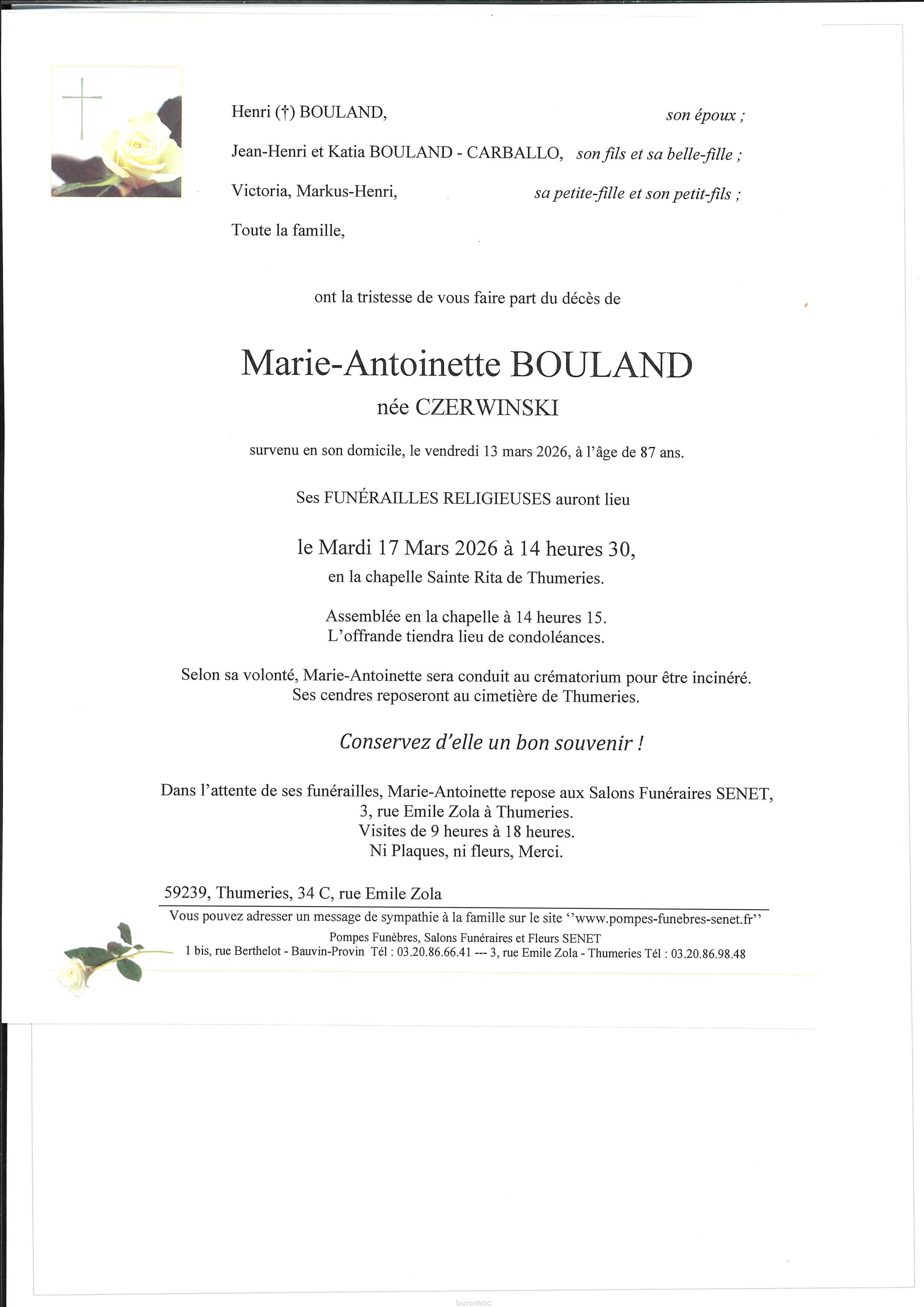 Avis de décès de Madame Marie-Anoinette BOULAND