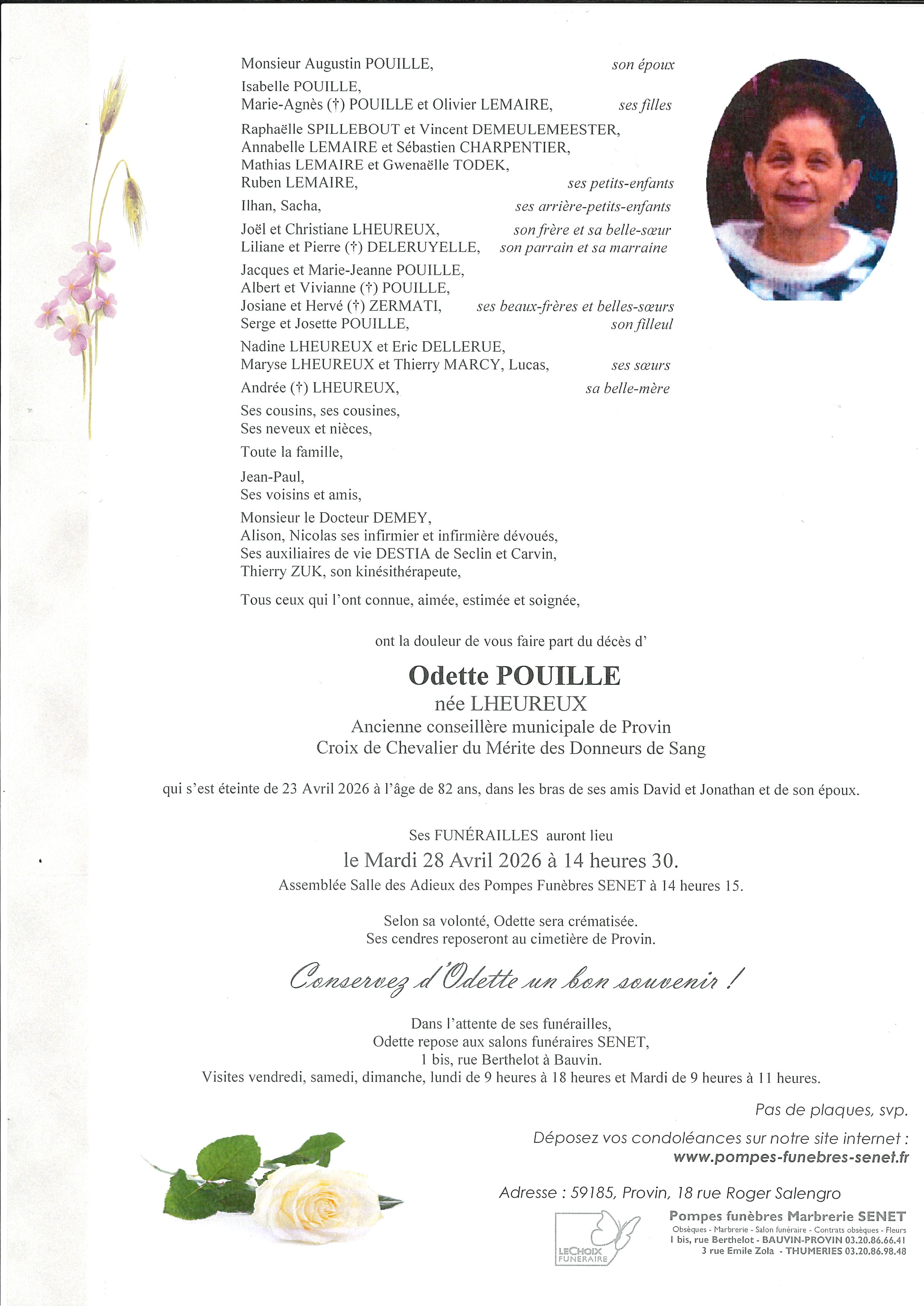 Cette page vous permet de présenter vos condoléances à la famille et de partager l'espace hommage de Odette.