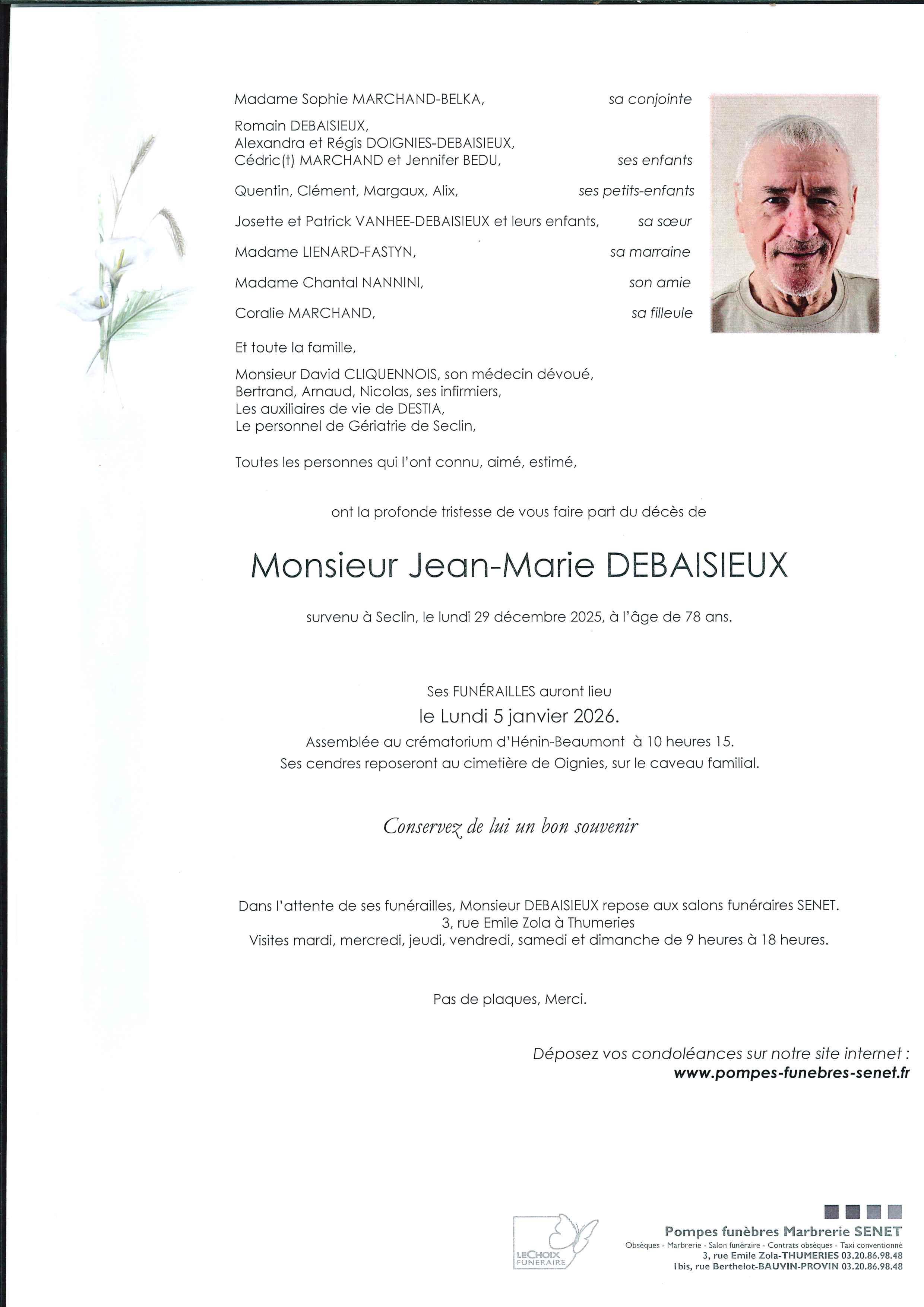 Avis de décès de Monsieur Jean-Marie DEBAISIEUX